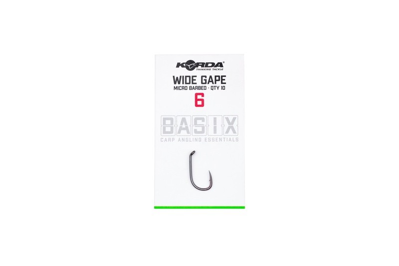 Куки Korda Basix Wide Gape – Куката Basix Wide Gape е проектирана като перфектен универсален модел, който може да се използва директно от опаковката за голямо разнообразие от монтажи с бойлита, wafters и дори поп-ъп. Агресивното, обърнато навътре ухо помага да се гарантира, че тя се обръща и задържа в устата на шарана. Изработена е от нашата тел с размер „X“, така че е подходяща за риболов на едри шарани благодарение на своята здравина, а също така има ненатрапчиво черно никелово покритие. Върхът е проектиран да бъде дълготраен и е възможно да хванете множество риби на една и съща кука, преди да се наложи да я смените – всеки път, когато хвърляте обаче, проверявайте дали е все още остра и я сменяйте, ако не е. Формата е базирана на невероятно ефективната оригинална Wide Gape, която е отговорна за улова на безброй големи шарани през годините.