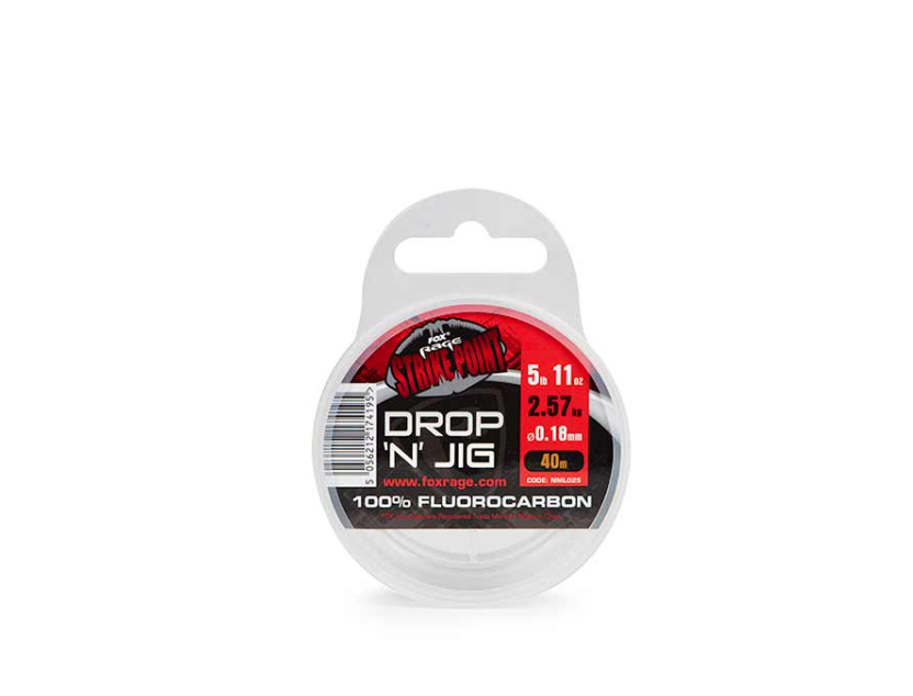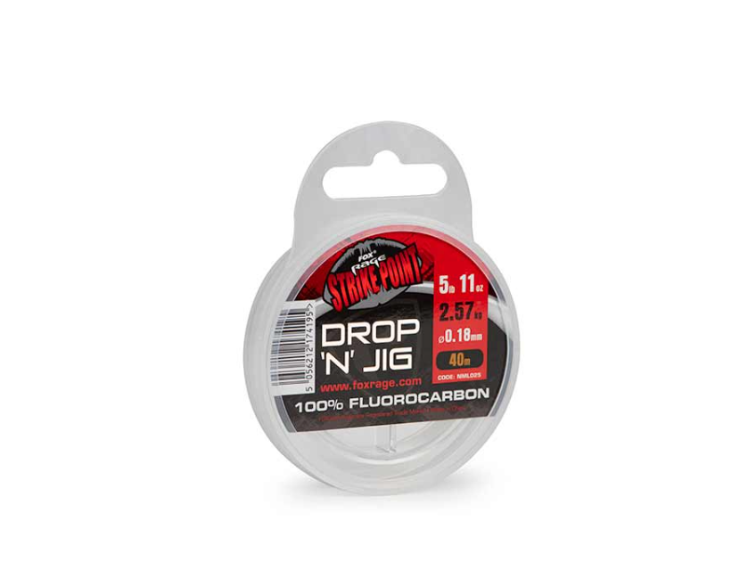 Флуорокарбон Fox Rage Strike Point Drop N Jig Fluorocarbon – Специално създаден за риболов на хищници. Перфектен избор при риболов на джиг и дроп шот. Флуорокарбонът е с висока устойчивост на абразия и почти невидим във вода. Предлага се в удобни ролки с дължина 40м.