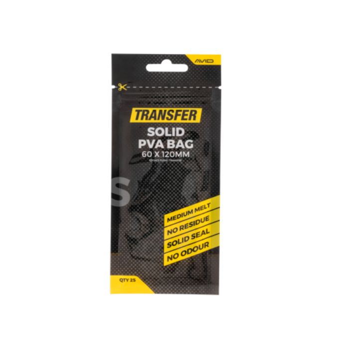 PVA торбички AVID CARP Transfer Solid PVA – Small – Тези PVA торбички са с размери: 60х120мм. Създадени са от pH неутрален, неперфориран PVA филм, който гарантира бързо и качествено разтваряне във вода. Това ги прави подходящи за употреба през цялата година и в студена, и в топла вода. Материалът от който са изработени е от високо качество и не оставя никакви следи след разтваряне. Изключително здрави и устойчиви, което ги прави подходящи за пълнене с пелети, семена, натрошени топчета, царевица и др. Осигуряват естествено представяне на стръвта на дъното. Размери: 60х120мм.